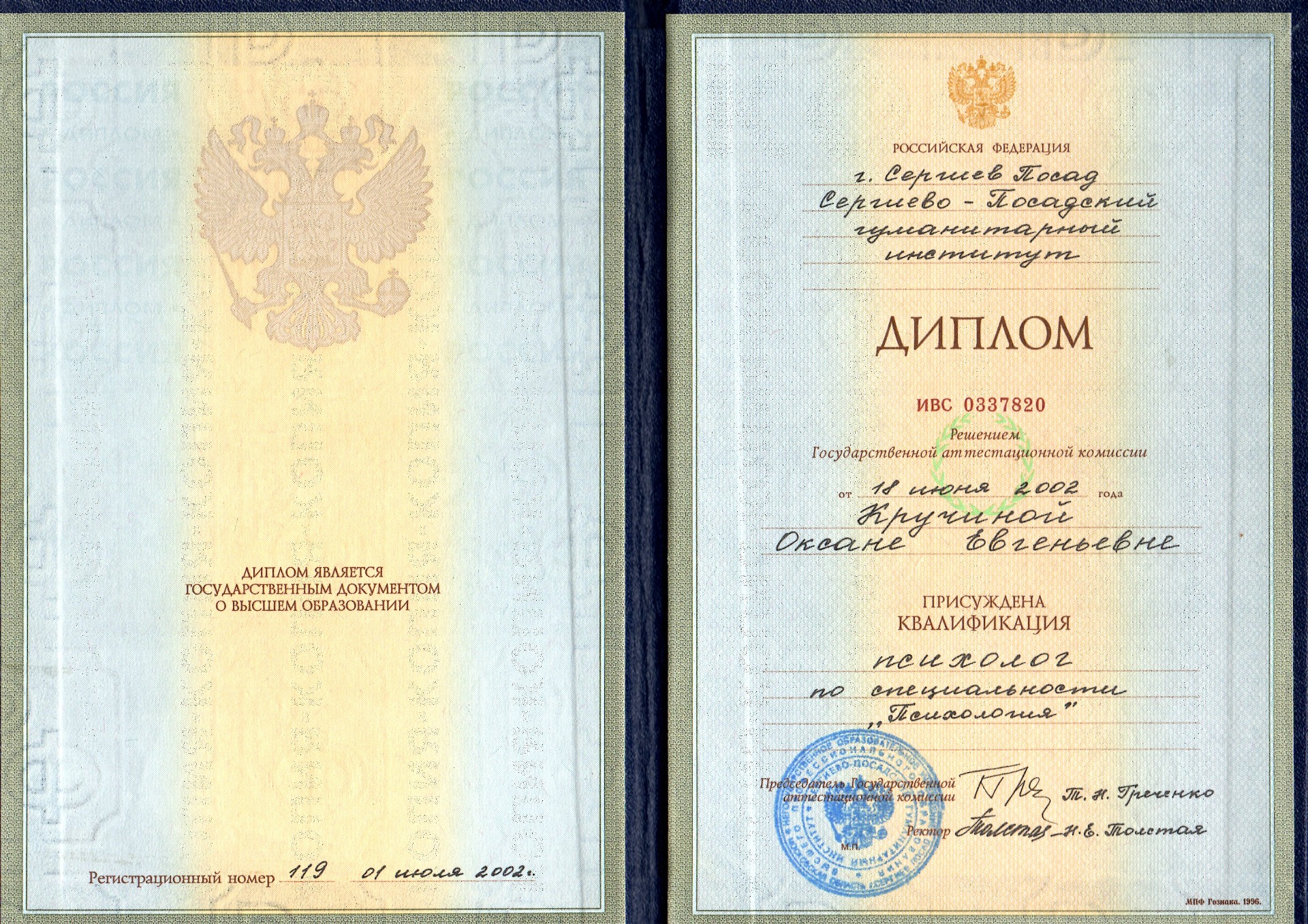 - 2002 г. - Сергиево-Посадский гуманитарный институт, г. Сергиев Посад. Квалификация: психолог по специальности "Психология".