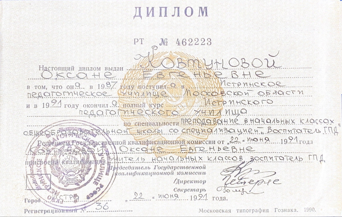 - 1991 г.- Истринское педагогическое училище Московской области, г. Истра. Квалификация: учитель начальных классов.